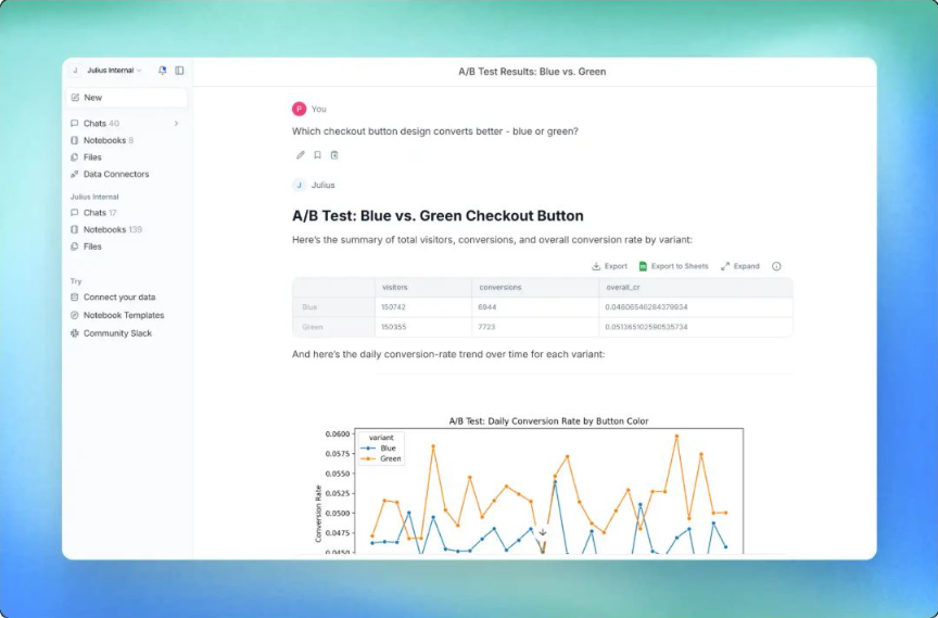 Its ability to analyze data from multiple sources is a core strength of AnalysisGPT, which is built to answer questions that pull from more than one connected system. Julius AI is built for deep analysis of one dataset at a time, whether that’s an uploaded file or a connected database.