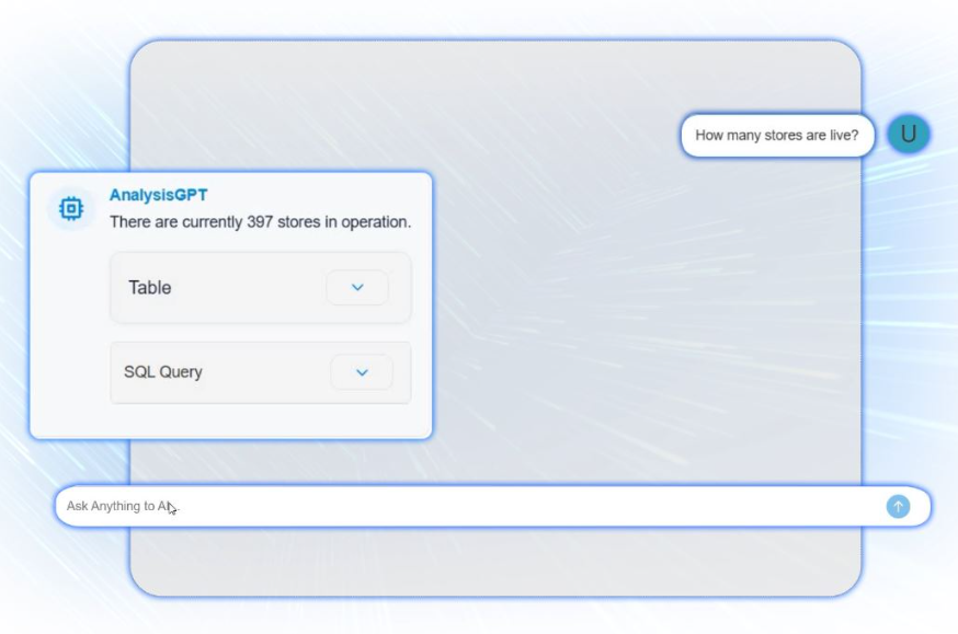 AnalysisGPT’s LLM receives only column fields and table metadata, formats the query, and then executes it against the database with read-only access. User data never leaves its systems and is never sent to the model.