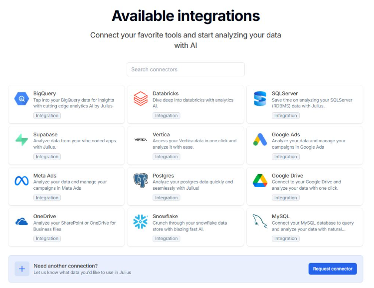 AnalysisGPT is oriented toward connectors for SMB operational tools like accounting, ecommerce, POS, and CRM, with Shopify and Square coming soon. Julius AI’s connectors skew toward data warehouses, cloud storage, and ad platforms, which fit teams already working inside those environments.