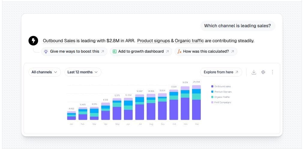 - Cross-source analysis: Connect multiple data sources and get unified answers in one place.