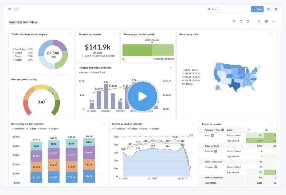 - No-ETL architecture: Skip the data pipeline setup that slows traditional BI.